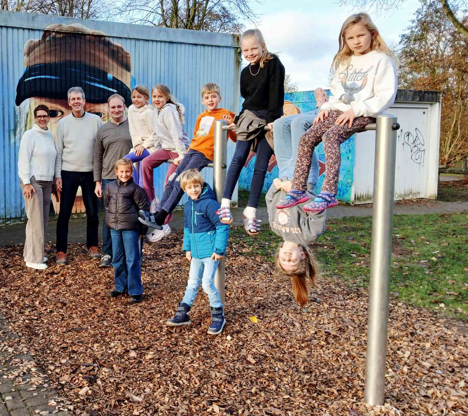 Gemeinsam mit Wilhelm Rulle von der Bürgerstiftung, Thomas Flenker vom Förderverein und der Schulleiterin Sabine Schäfer freuen sich die Schüler und Schülerinnen der Kardinal-von-Galen-Grundschule in Lette, endlich in den Pausen wieder Felgaufschwung und Co. üben zu können..